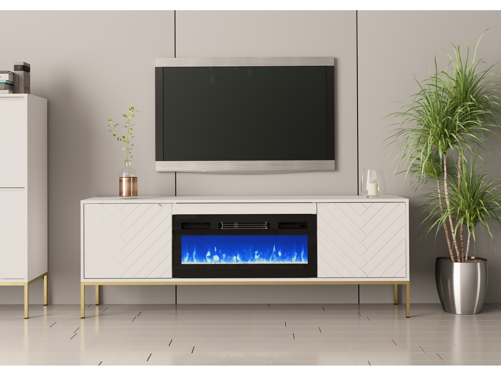 Połączenie minimalistycznej bieli ze złotymi akcentami i realistycznym efektem płomienia sprawia, że mebel staje się centralnym punktem salonu, łącząc funkcjonalność z wyjątkowym stylem.