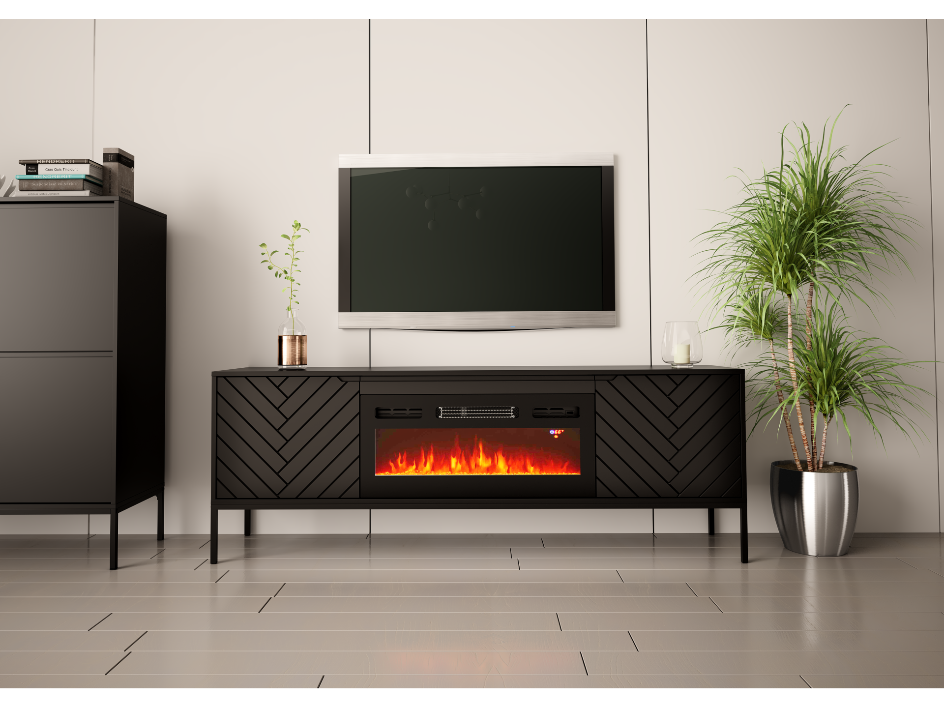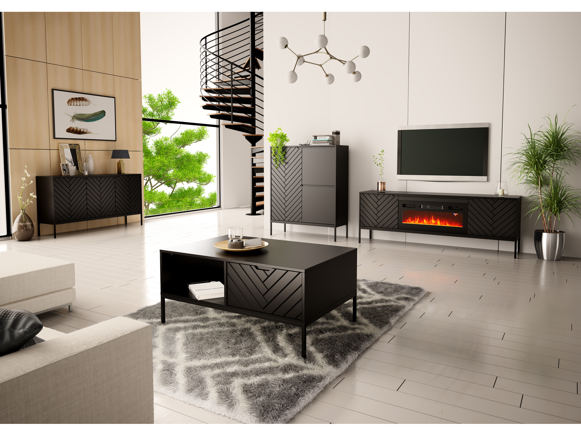 Minimalistyczna forma, jednolita czerń i efektowny kominek LED tworzą niepowtarzalne połączenie loftowej elegancji z przytulnym nastrojem.
