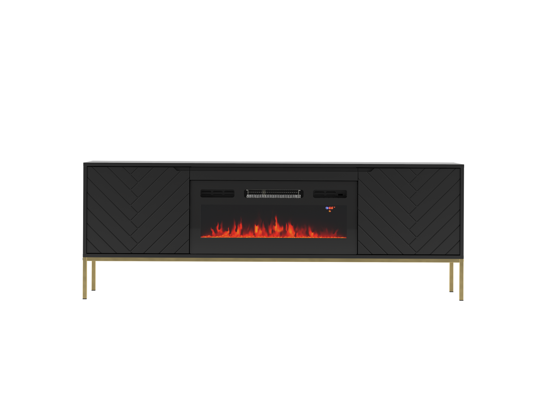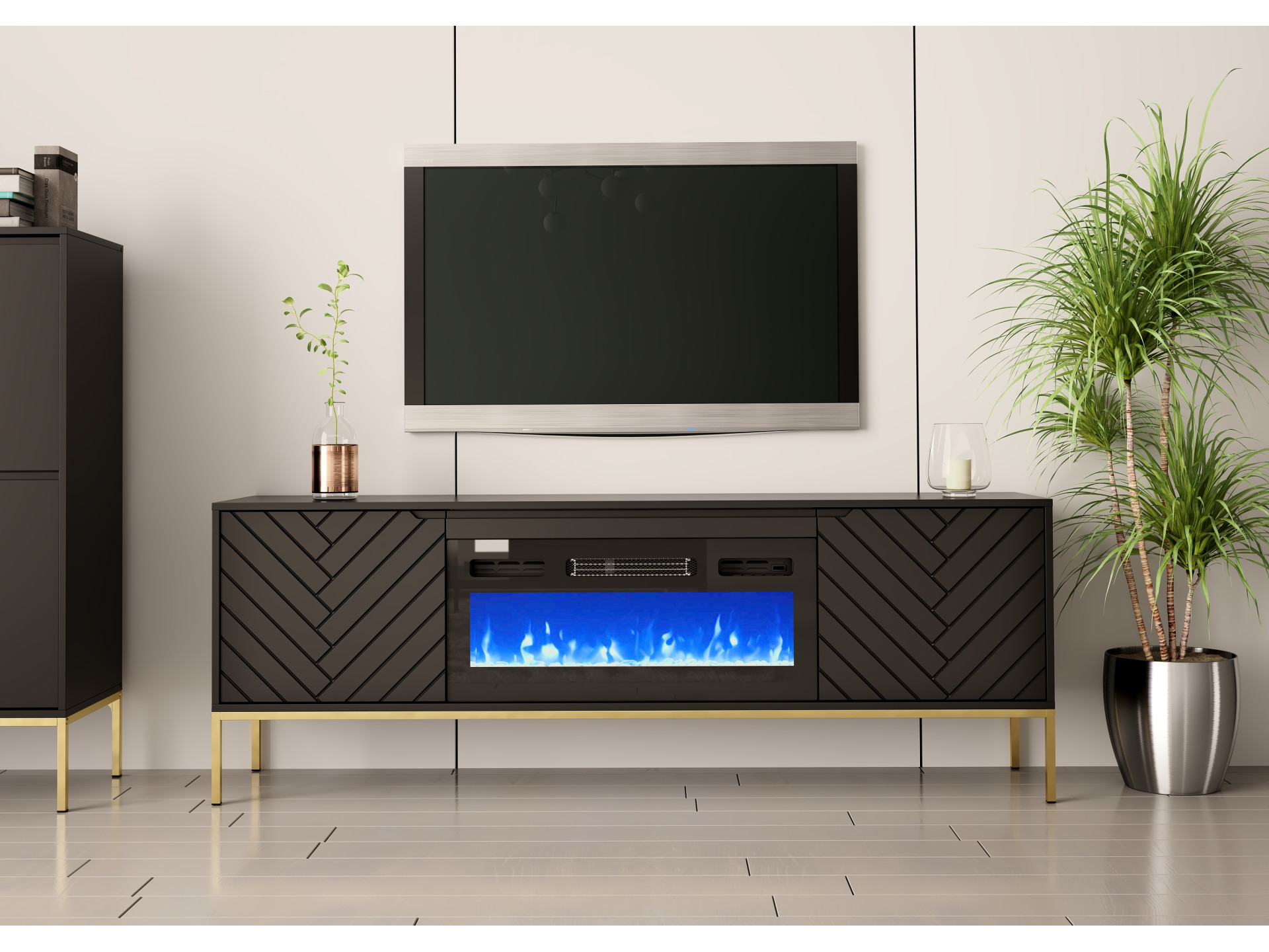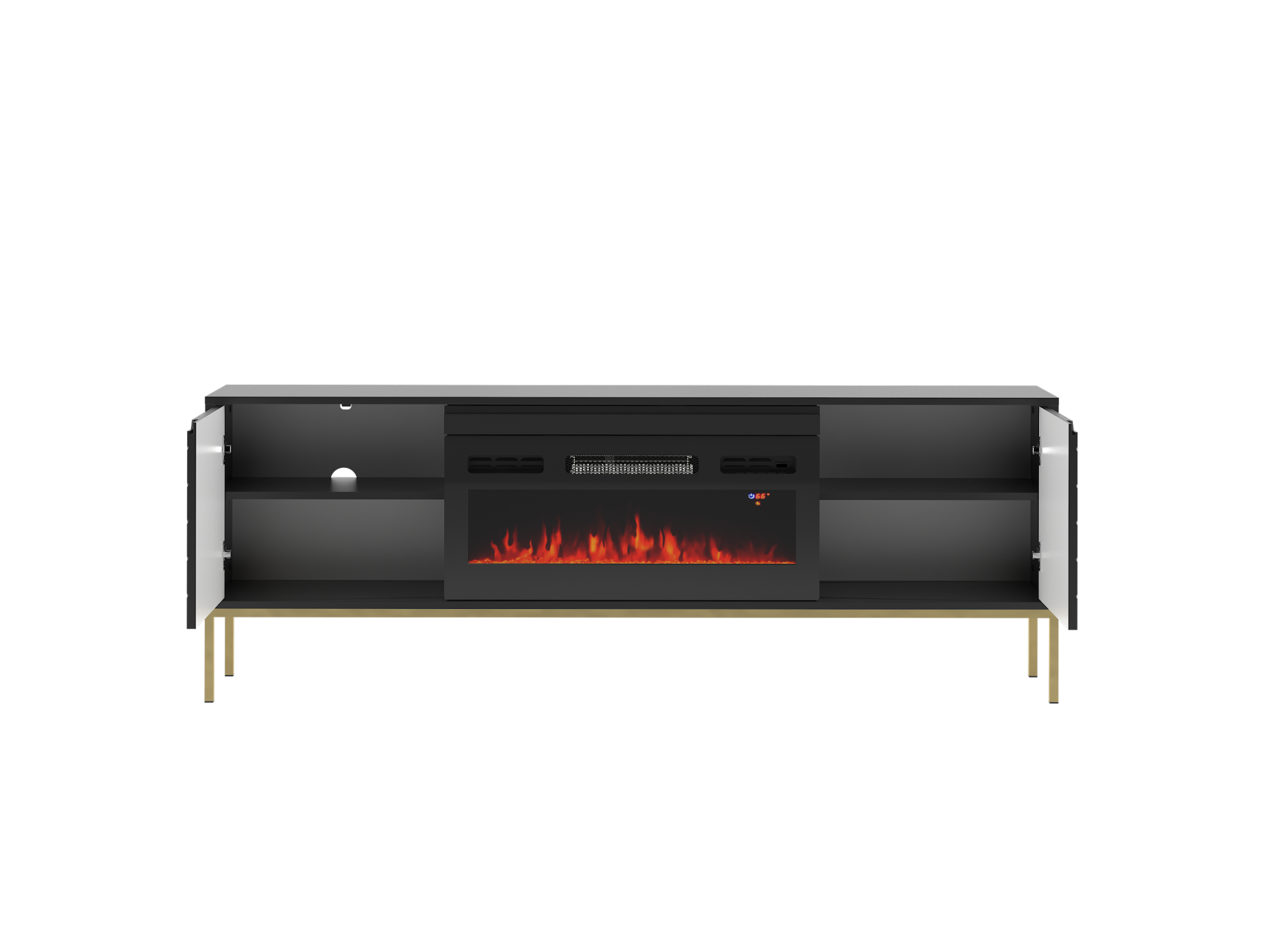 Szafka RTV z kominkiem ASPEN Czarny Mat na złotym stelażu – 1 szt.
