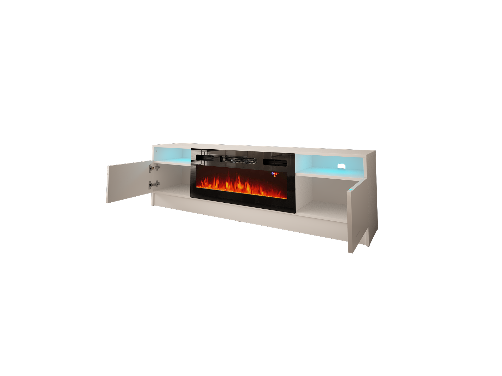 Model DUKE-01 to idealne rozwiązanie do salonu – pełni funkcję praktycznej szafki RTV oraz designerskiego elementu aranżacji. Wbudowany kominek elektryczny z efektem płomienia (kilka kolorów do wyboru) i funkcją grzania zapewnia nie tylko wyjątkowy nastrój, ale i dodatkowe źródło ciepła. Oświetlenie LED RGB sterowane pilotem podkreśla nowoczesny charakter mebla.