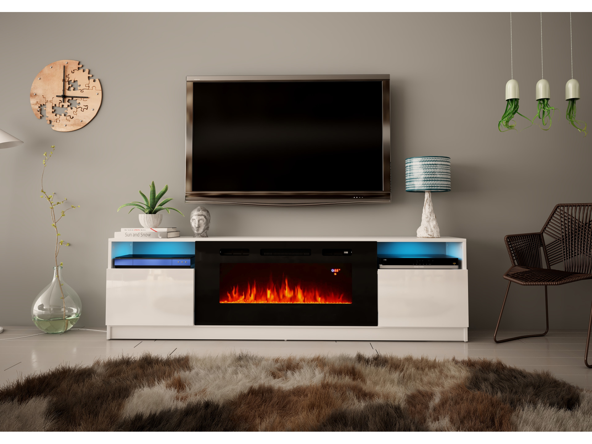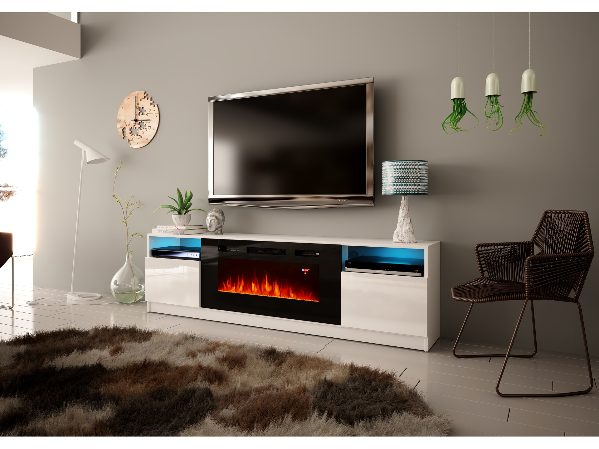 Mebel został zaprojektowany tak, aby połączyć praktyczne przechowywanie sprzętu RTV z estetycznym akcentem w postaci kominka elektrycznego. Szeroki blat pomieści duży telewizor, a zamykane szafki i otwarte półki zapewniają miejsce na dekodery, konsole i akcesoria. Kominek elektryczny imituje realistyczny efekt płomienia, tworząc przytulny nastrój niezależnie od pory roku.